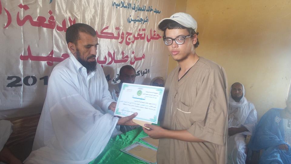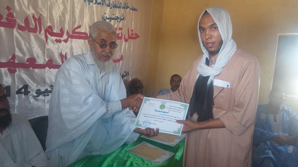 وقد تخلل النشاط عدة فقرات بدأت بكلمة باسم أساتذة المعهد كانت مع الأستاذ أحمدو سالم ولد المصطفى، ونوه في كلمته إلى أهمية ما يهدف إليه المعهد من: أهمية الرفع من شأن تعليمنا الأصلي، وربط الأجيال بالكتاب والسنة ، ومكافحة الجهل والغزو والثقافي، وإعداد أجيال من الشباب الصالح في مجال التعليم والدعوة والقضاء. ثم تلتها كلمة باسم الطلبة كانت مع الطالب محمد ولد إدومو ثم كلمة باسم الضيوف كانت مع الأمين العام المساعد لجمعية الخير للتكافل الاجتماعي، الذي نوه بدور بهذا المعهد في نشر العلوم الإسلامية واللغة العربية. بعد ذلك جاءت مداخلة المدير العام للمعهد الأستاذ سيدي محمد حيلاجي وخلال مداخلته أشار إلى تاريخ إنشاء المعهد 1986 والدفعات التي تخرجت منه، وإلى أهدافه والصعوبات التي تواجهه وفي مقدمتها تهالك المباني وضيقها مما اضطرهم إلى إجراء الامتحانات داخل جامع المعهد. وأشار المدير إلى أن شهادات المعهد نالت سمعة طيبة في المشرق العربي وتمت معادلتها بالثانوية العامة في المملكة المغربية في الوقت الذي تجاهلتها السلطات الموريتانية!! وأشار معظم المتدخلين إلى ضرورة بناء حجرات كافية لهذا المعهد القديم، ذي العطاء المتميز. وفي ختام الحفل تم تكريم الخمسة الأوائل من الدفعة وجلهم من المغرب العربي. يذكر أن معهد خالد للمعارف الإسلامية من المعاهد القلة التي أنشئت في حقبة الثمانينات من القرن الماضي وكان من المفترض أن يكون ثانوية تمد معهد بن عباس بالطلبة لكي يكتمل بهما صرح علمي إسلامي من إعدادية وثانوية وجامعة، ورغم عدم تحقق المقصد منها ما زال يواصل أداءه حسب الإمكان، ويغالب الظروف. |